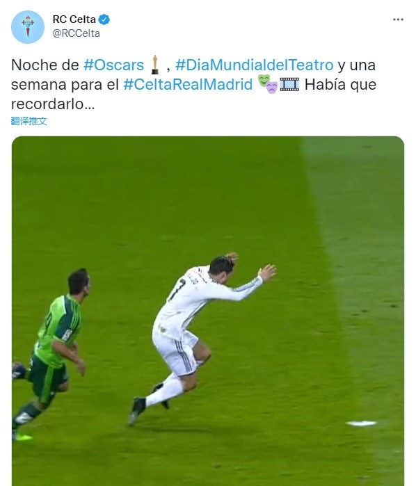 塞尔塔官推发布了一段C罗禁区内倒地的视频,并配文:“奥斯卡之夜、世界戏剧日,距离皇马vs塞尔塔还有一周,这一幕必须被铭记。”